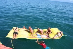 With snorkeling equipment, kayaks, and several paddle boards, there was lots to do when the boat was anchored in 2 different spots. This year, they had a new toy for us to play with too! A Lily-Pad – a big flat floating pad which could hold upwards of 10 people on it playing and laying in the sun on the waves out in the ocean; a great addition for this catamaran! If that’s not enough of a rush for you, they welcome you to jump off a ledge about 15 feet up and do the best dive, jump, canon ball, or back-flip you can!